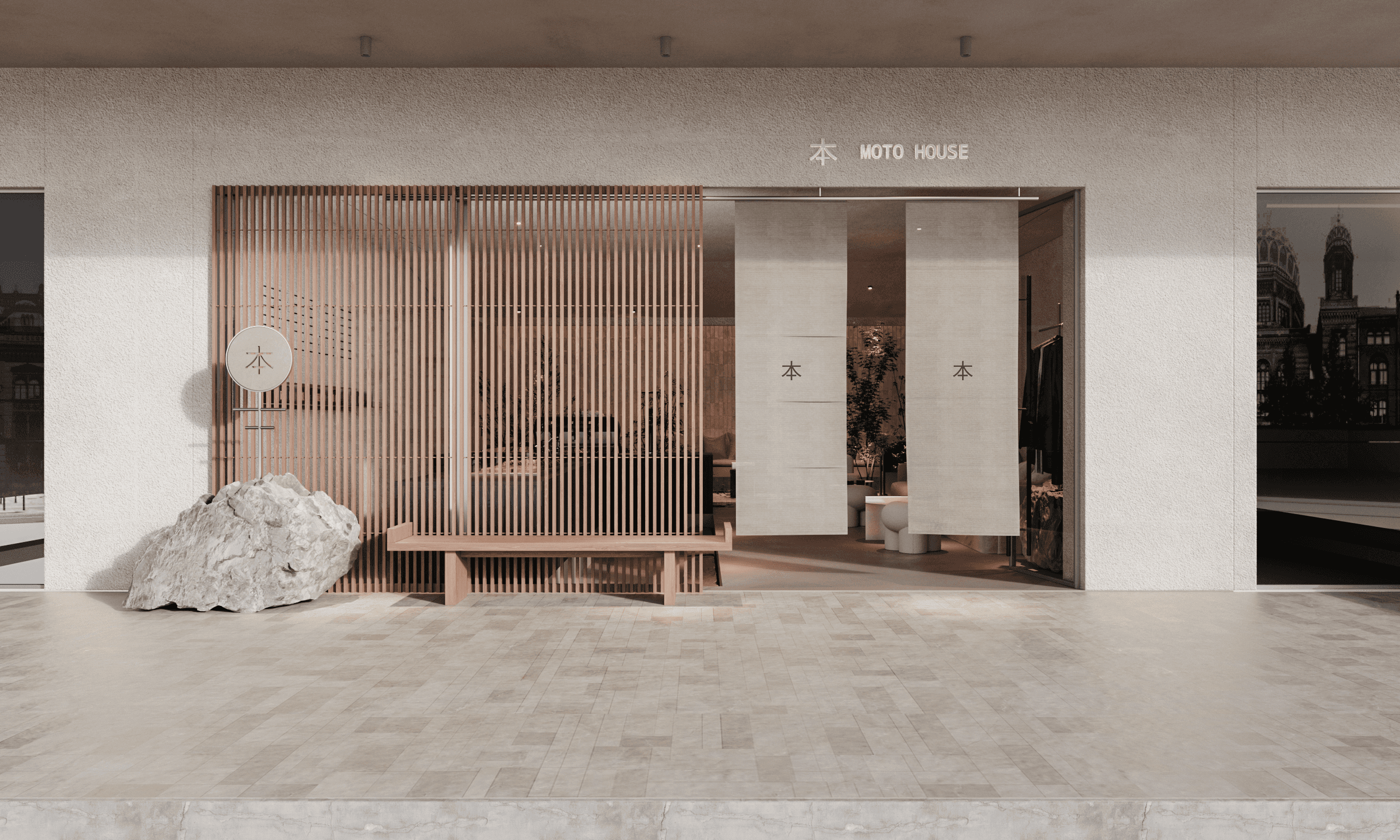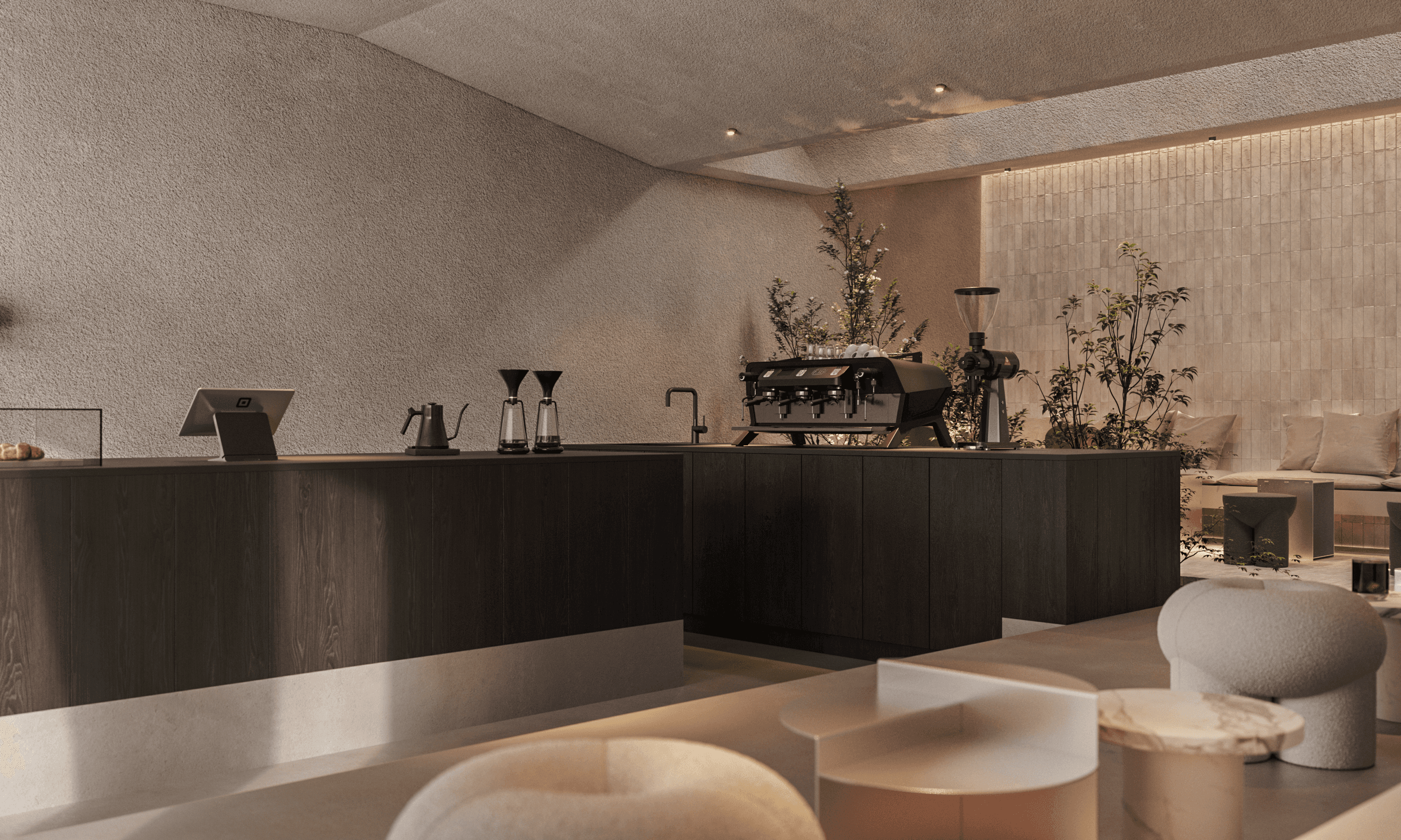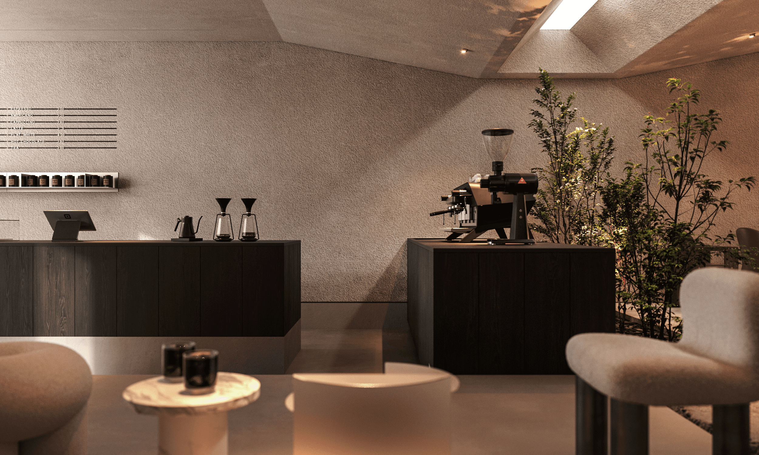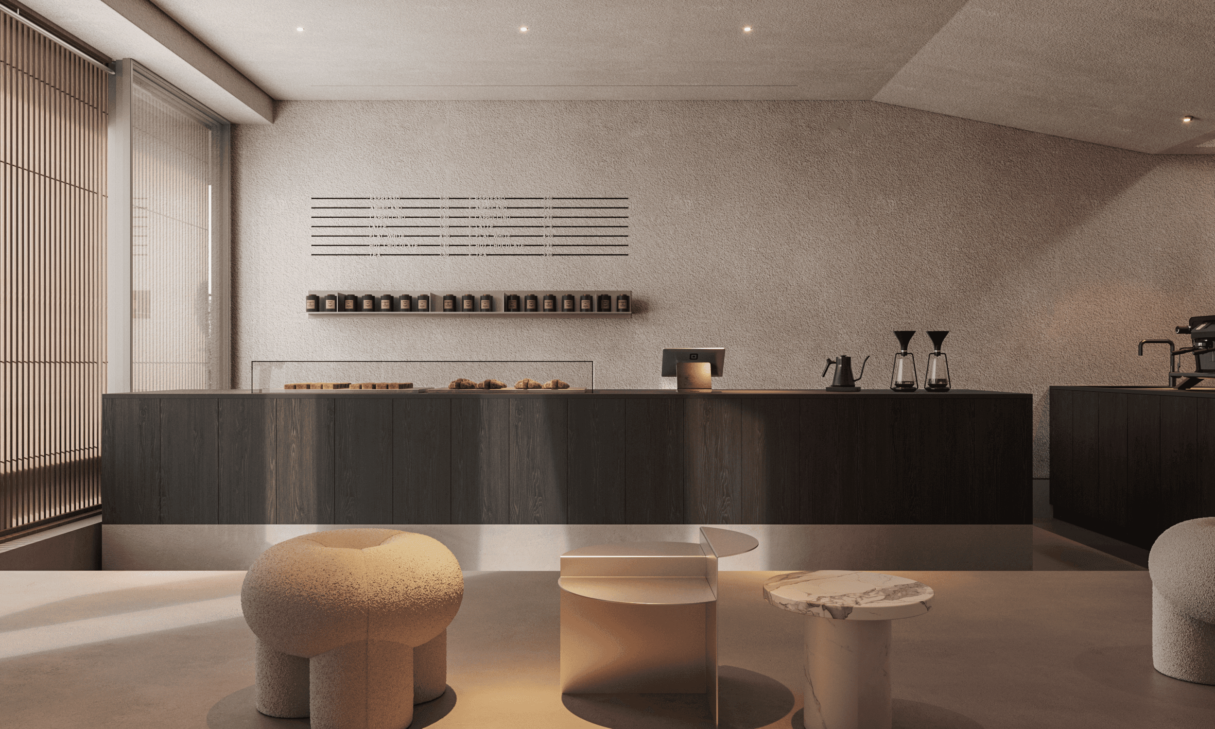 The interior of the Japanese coffee shop Moto House embodies elegance, functionality, and thoughtful aesthetics, creating the perfect space for relaxation and socializing.