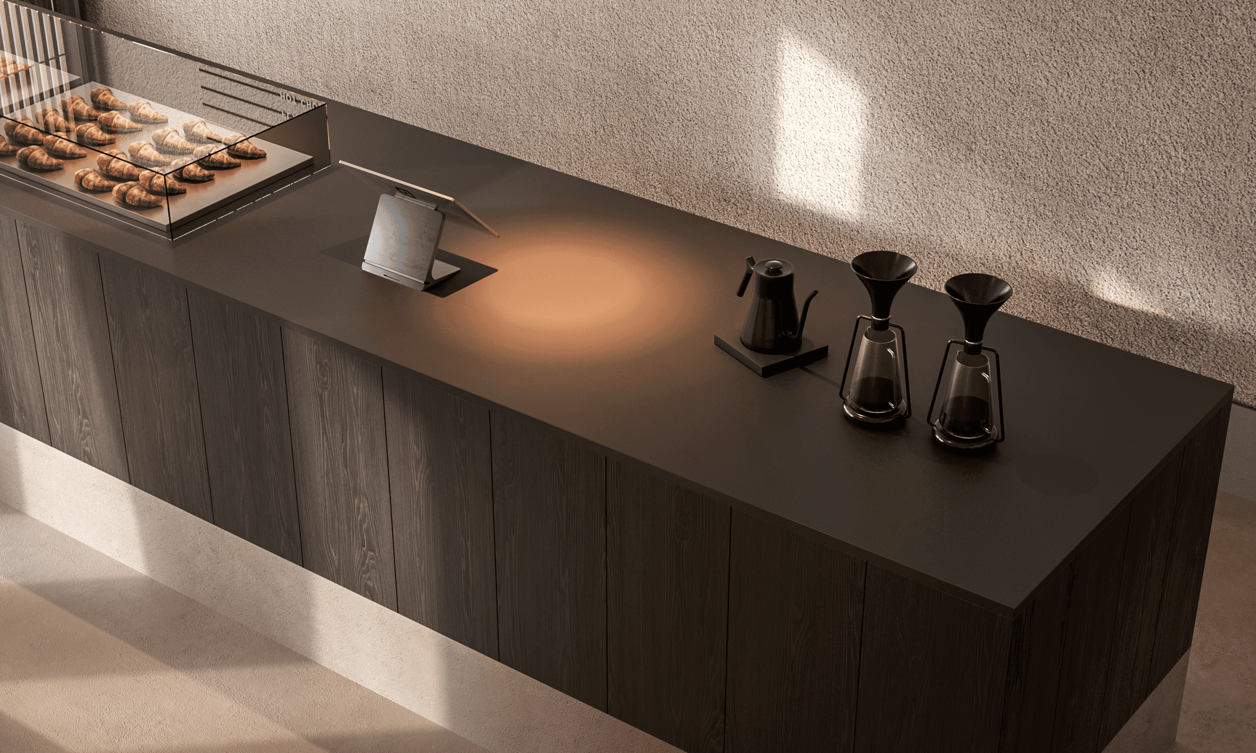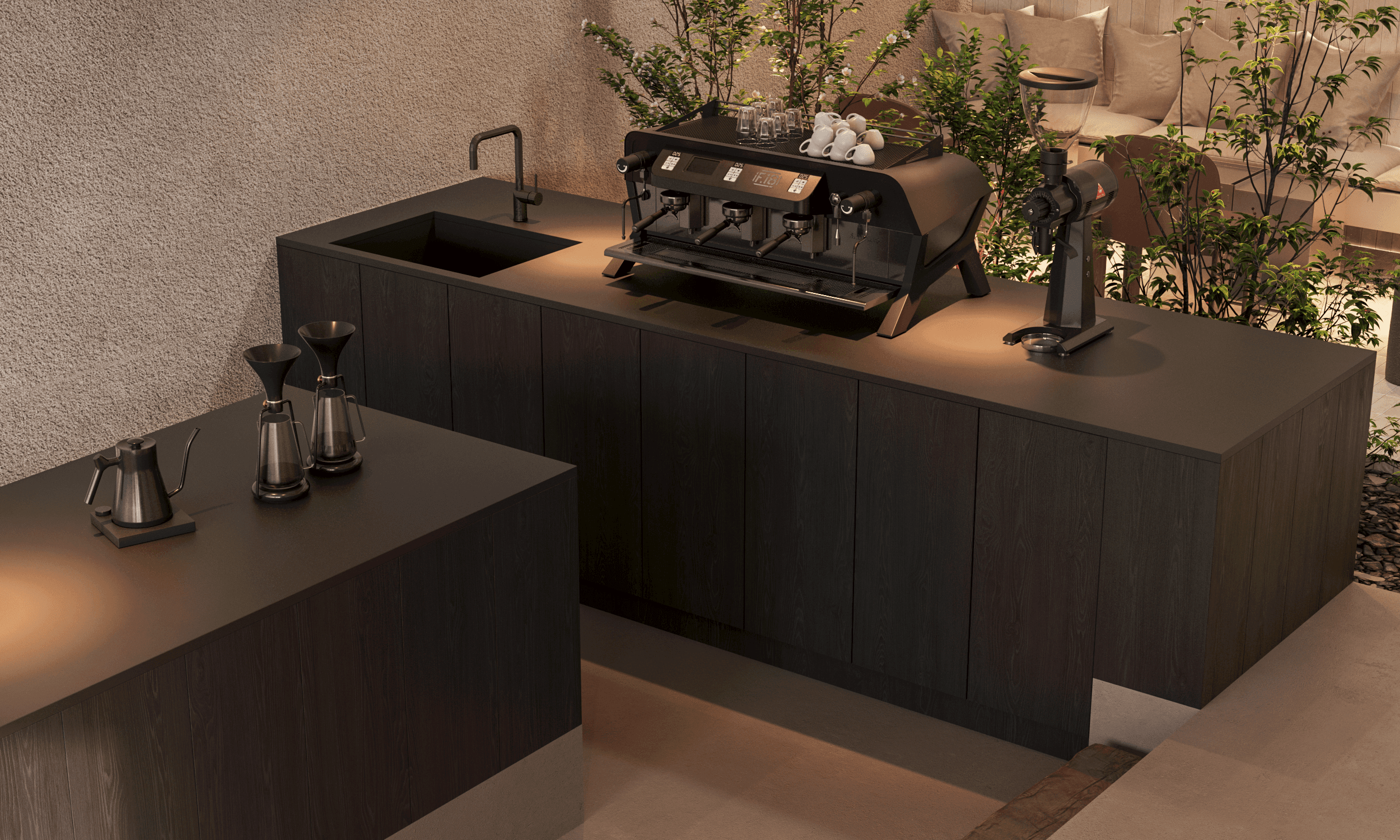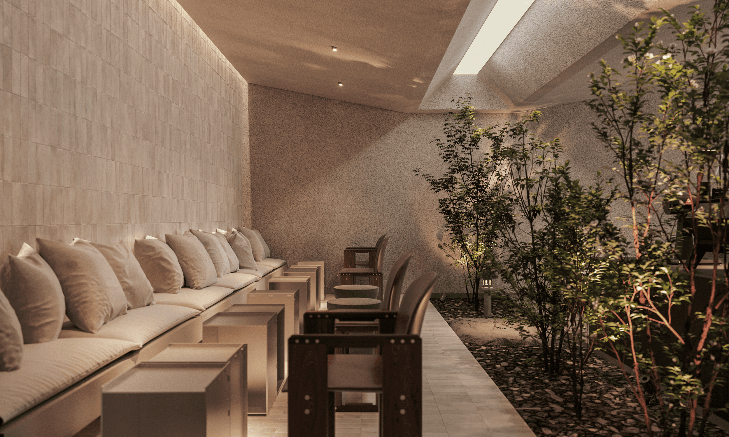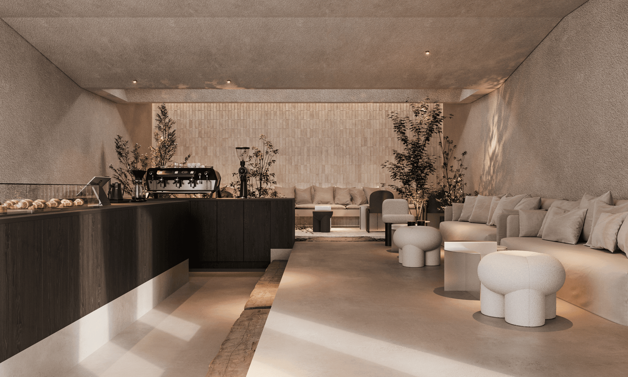 The interior of the Japanese coffee shop Moto House embodies elegance, functionality, and thoughtful aesthetics, creating the perfect space for relaxation and socializing.