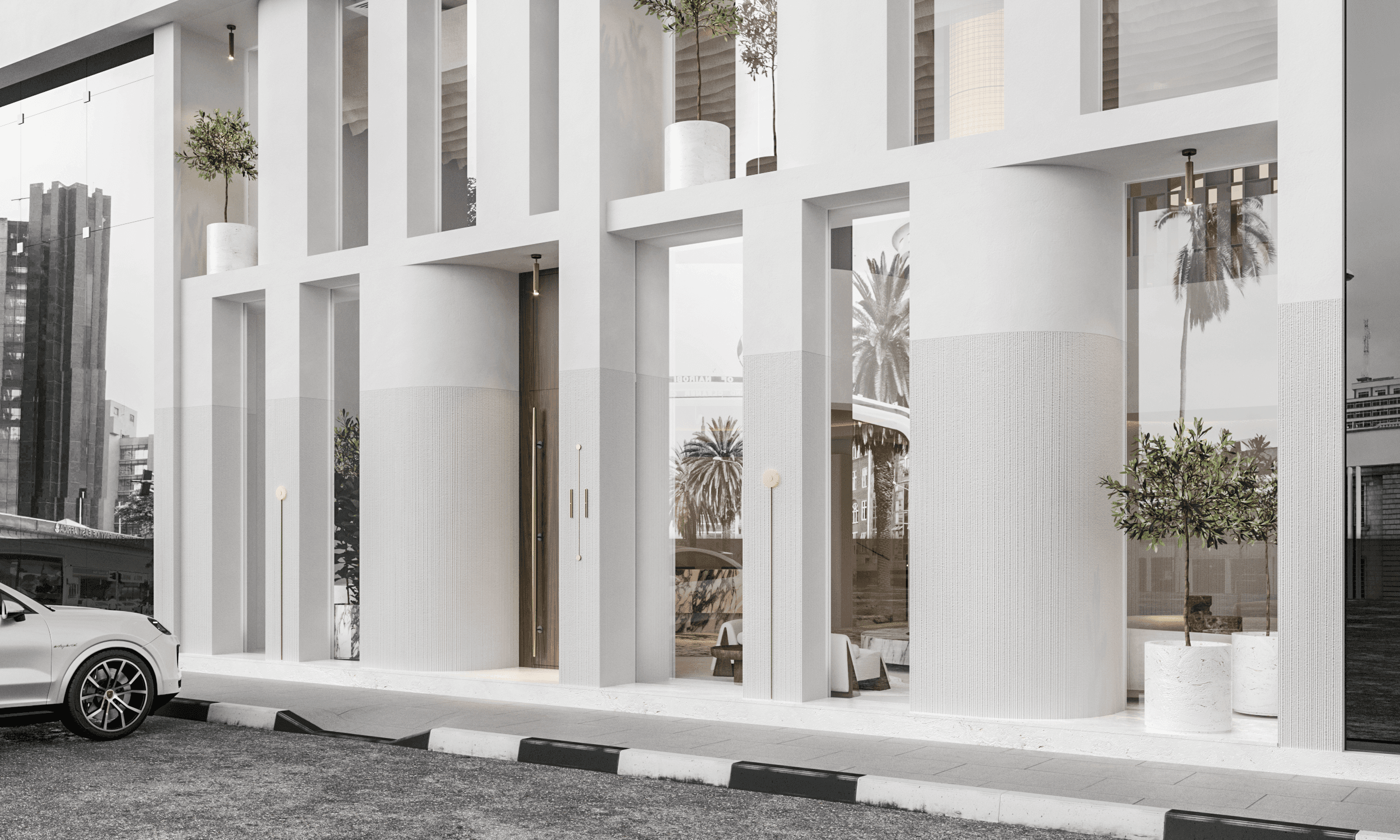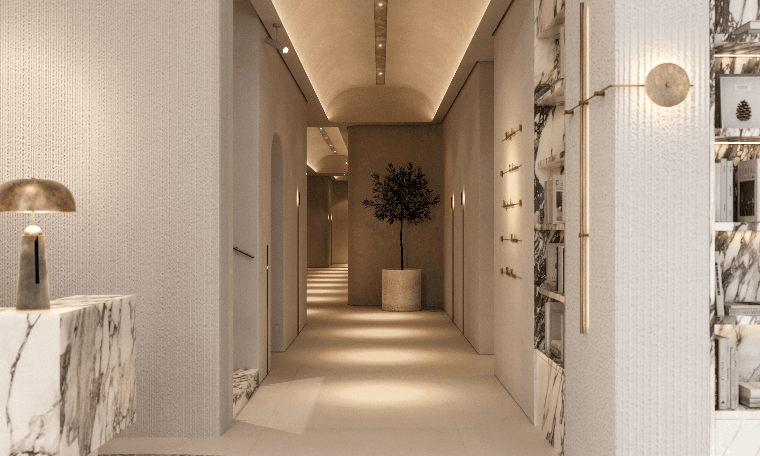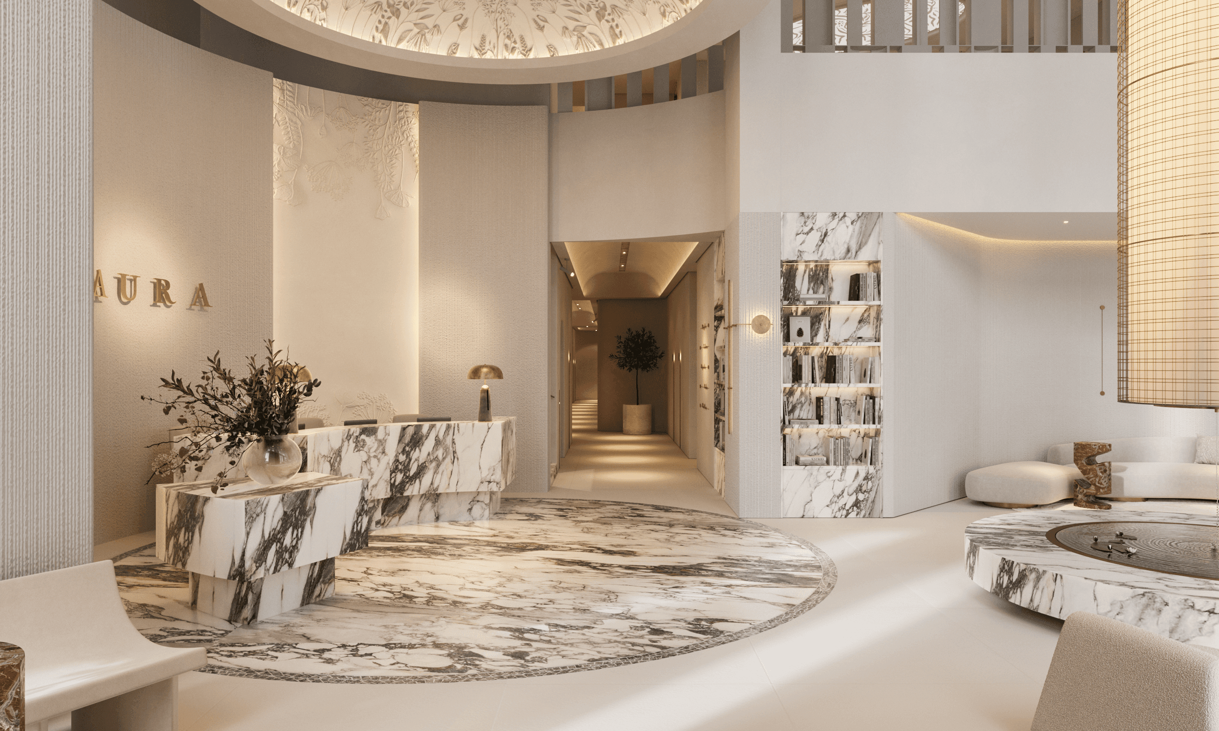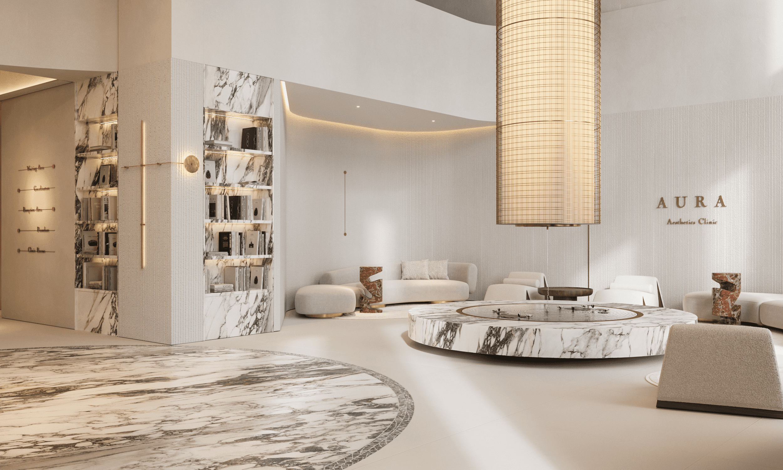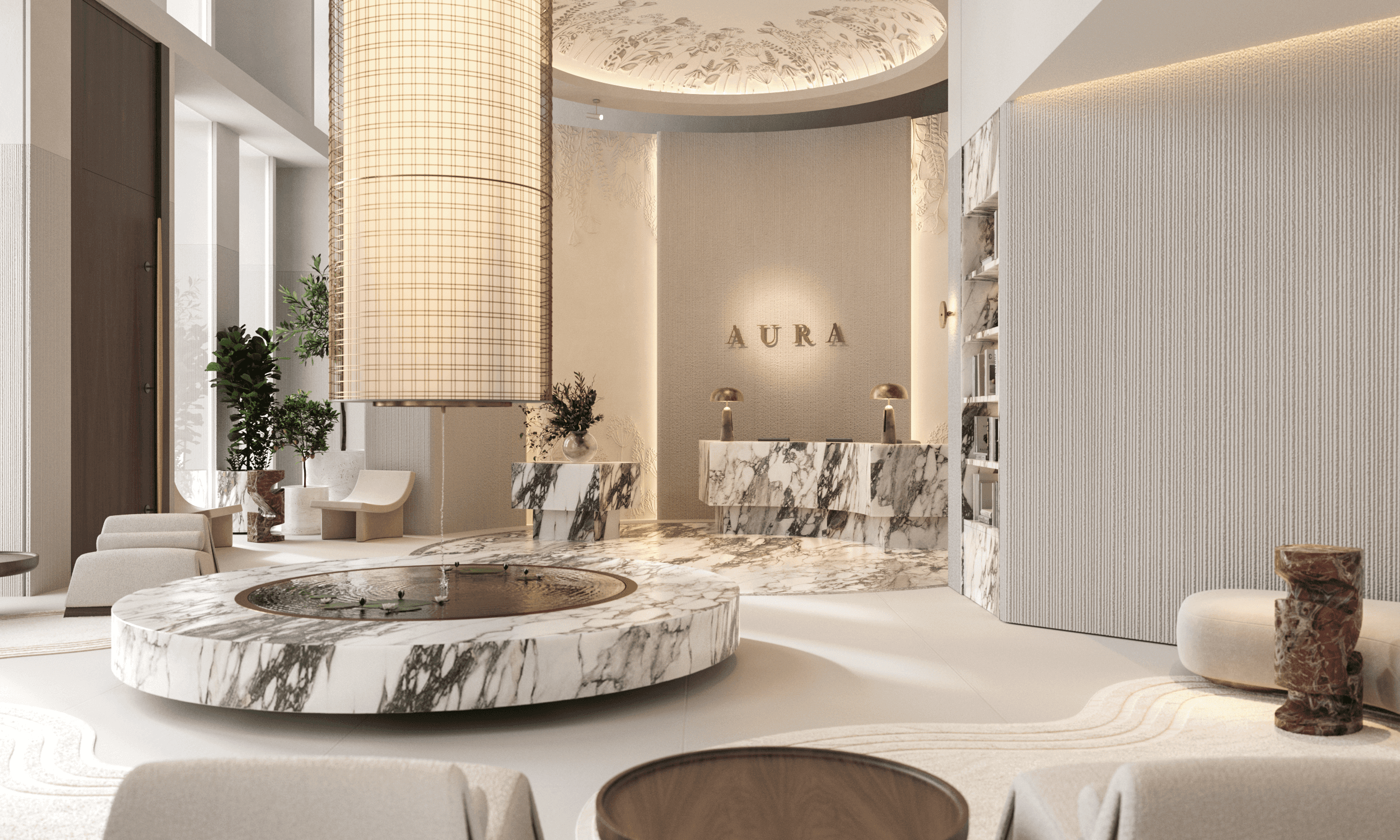 Arabescato marble is used as a central material in the reception and fountain areas, conveying both luxury and a natural sense of grounding.