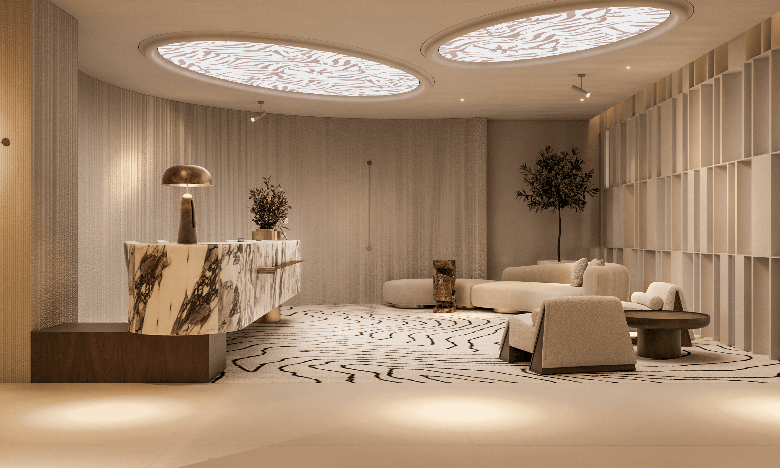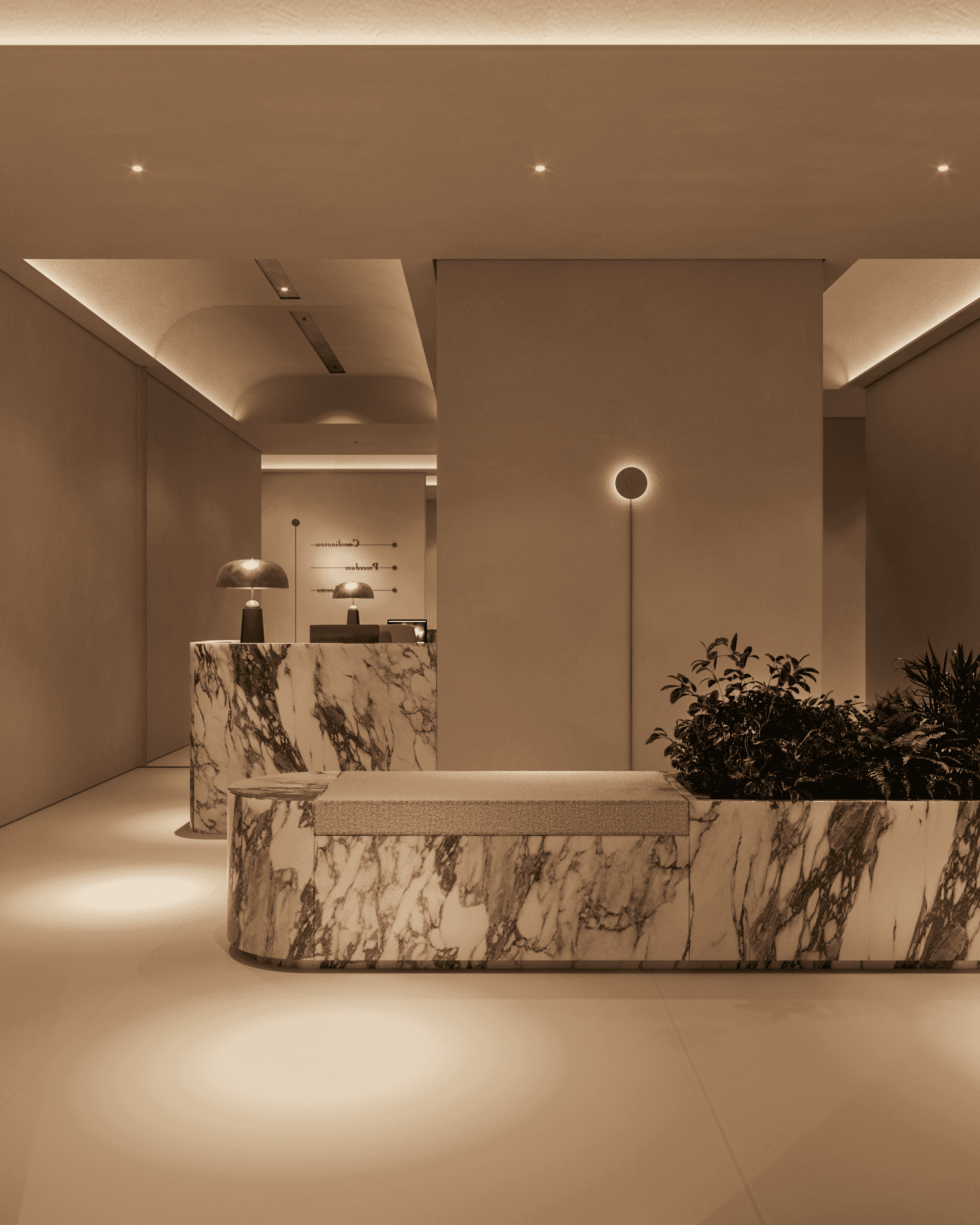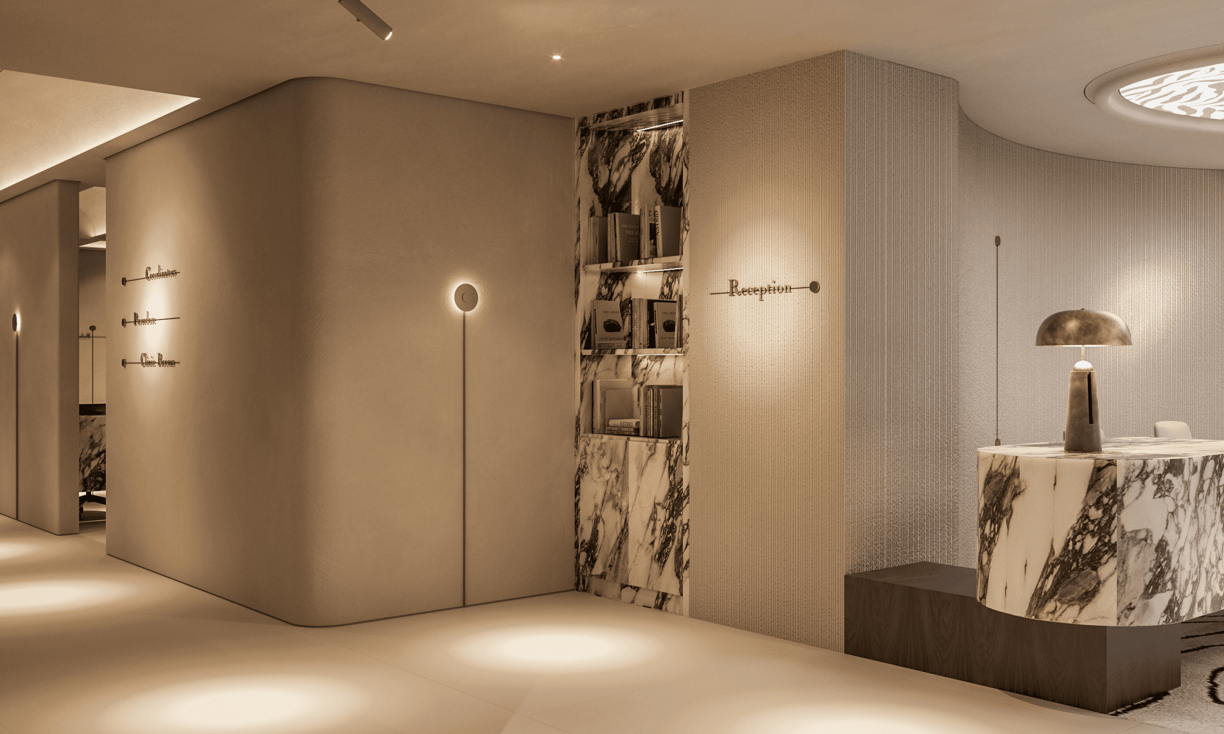 The reception desk is designed as a functional sculpture. Composed of layered blocks of Arabescato marble, it feels both architectural and expressive. The backdrop wall features delicate botanical bas-reliefs, evoking purity and referencing the organic nature of aesthetic medicine. Subtle lighting creates depth and softness.