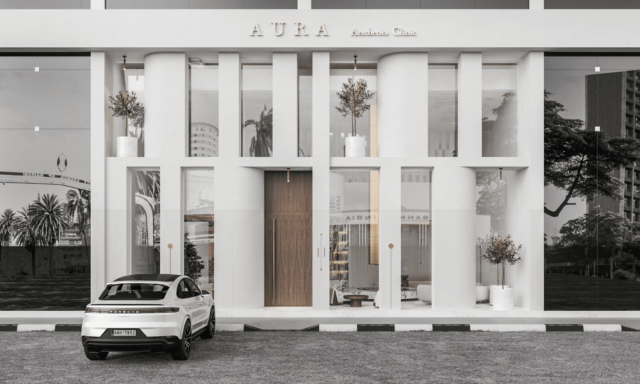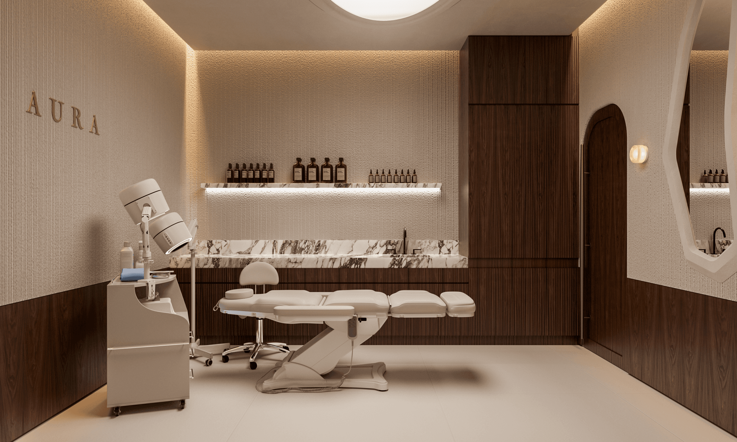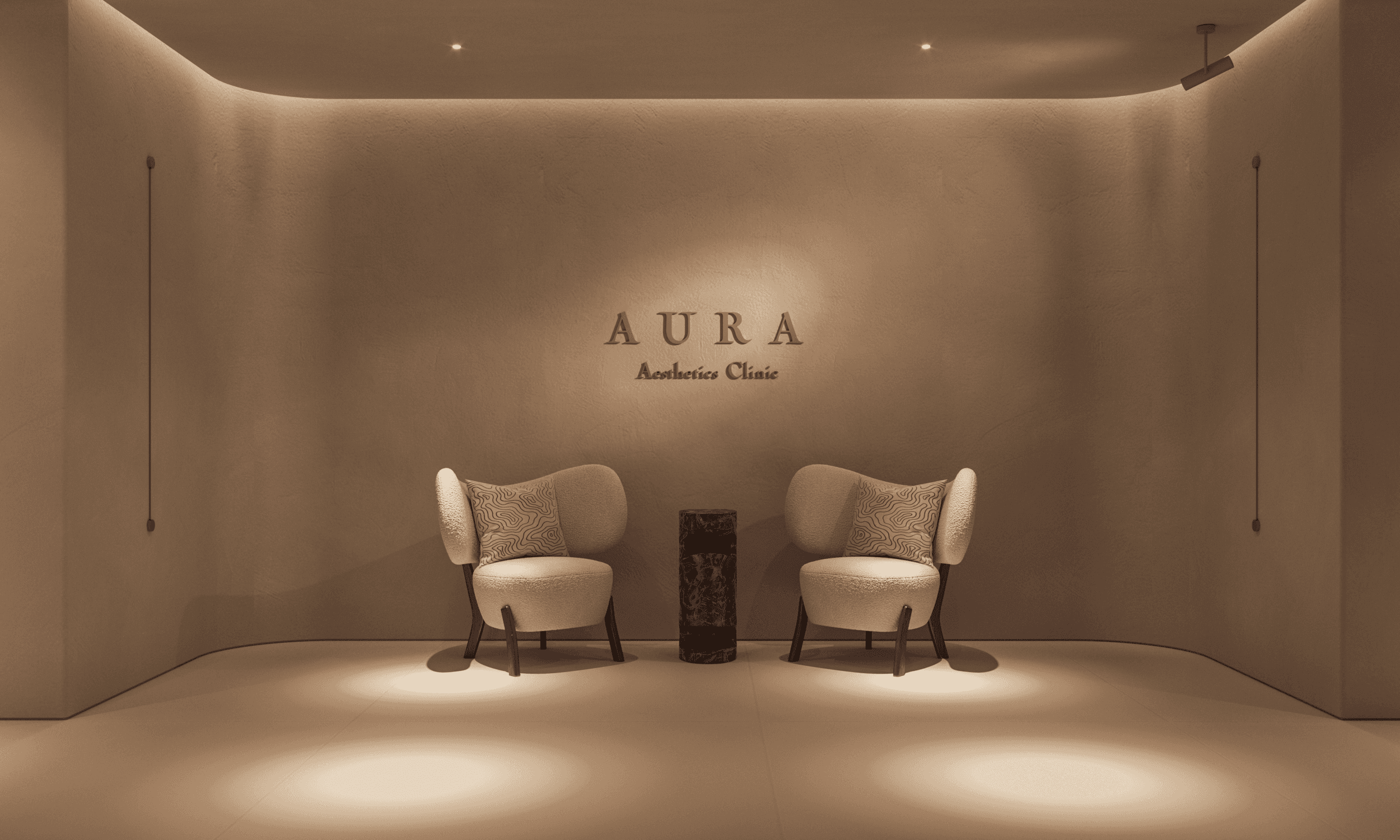 AURA is a space where aesthetics and medical precision are brought together through a visual language of calm and strength. The concept is rooted in the idea of the “aura” — an invisible yet tangible field that surrounds and defines our perception. This same field is reflected in the design — a spatial experience that evokes trust, serenity, and refined beauty.