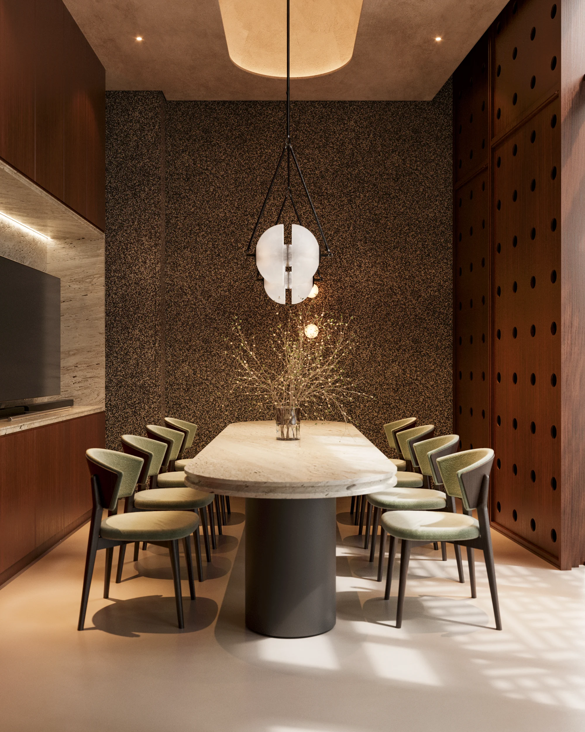 The interior features natural, warm shades: soft beige and sandy tones blend harmoniously with warm white, terracotta accents, and elegant golden details. Natural materials such as wood and stone enhance the organic aesthetic of the space.
