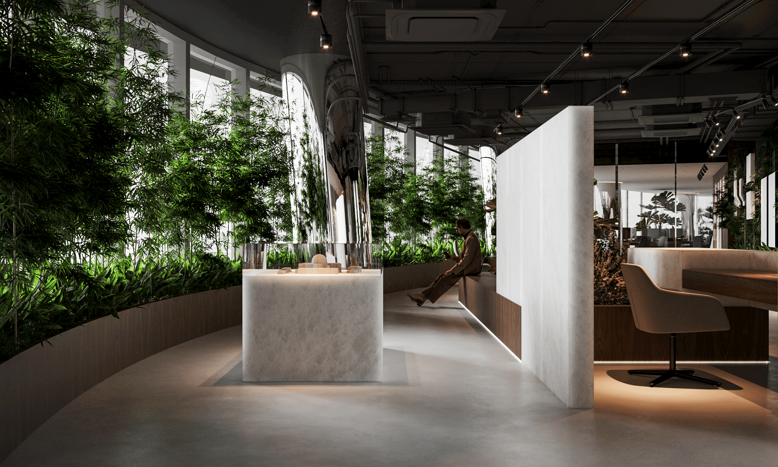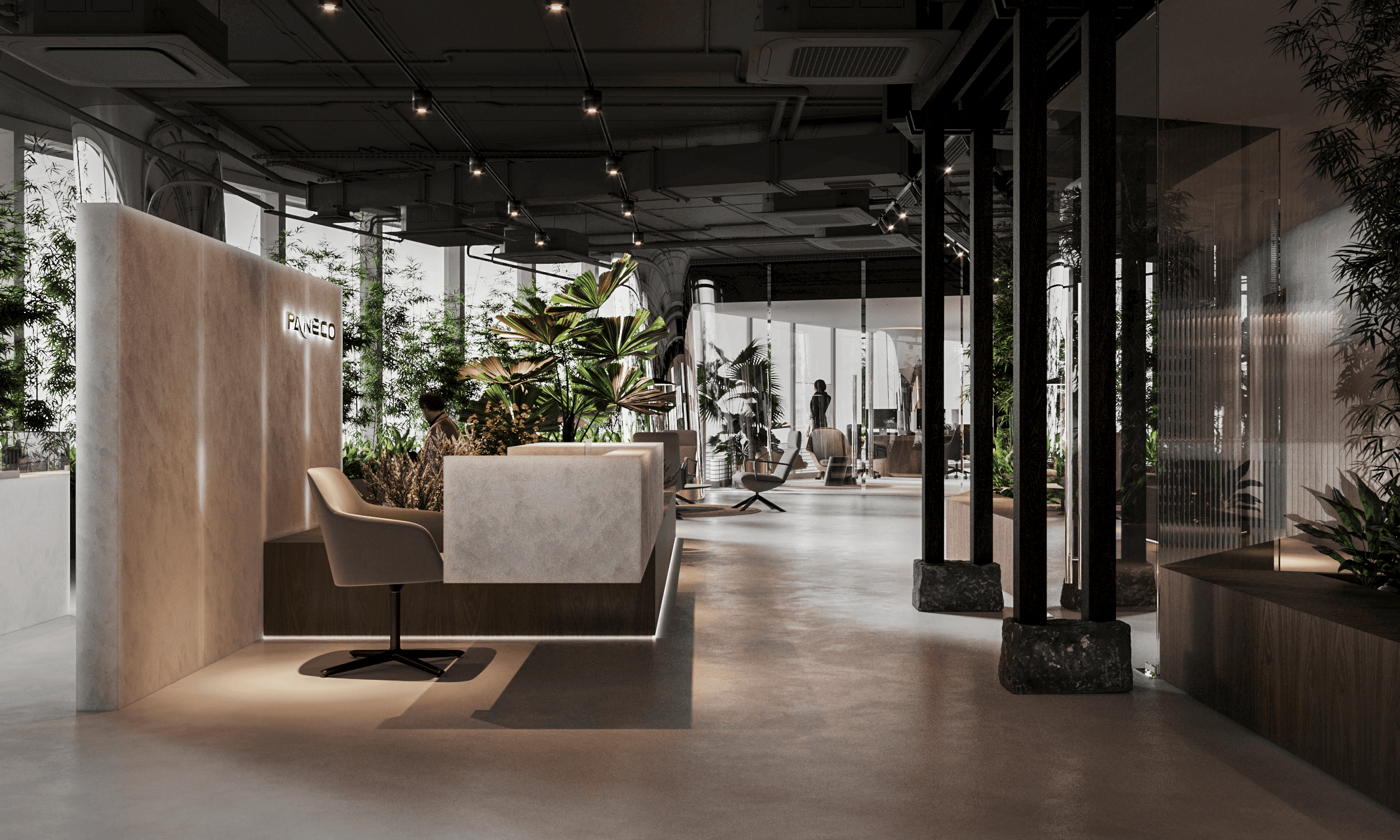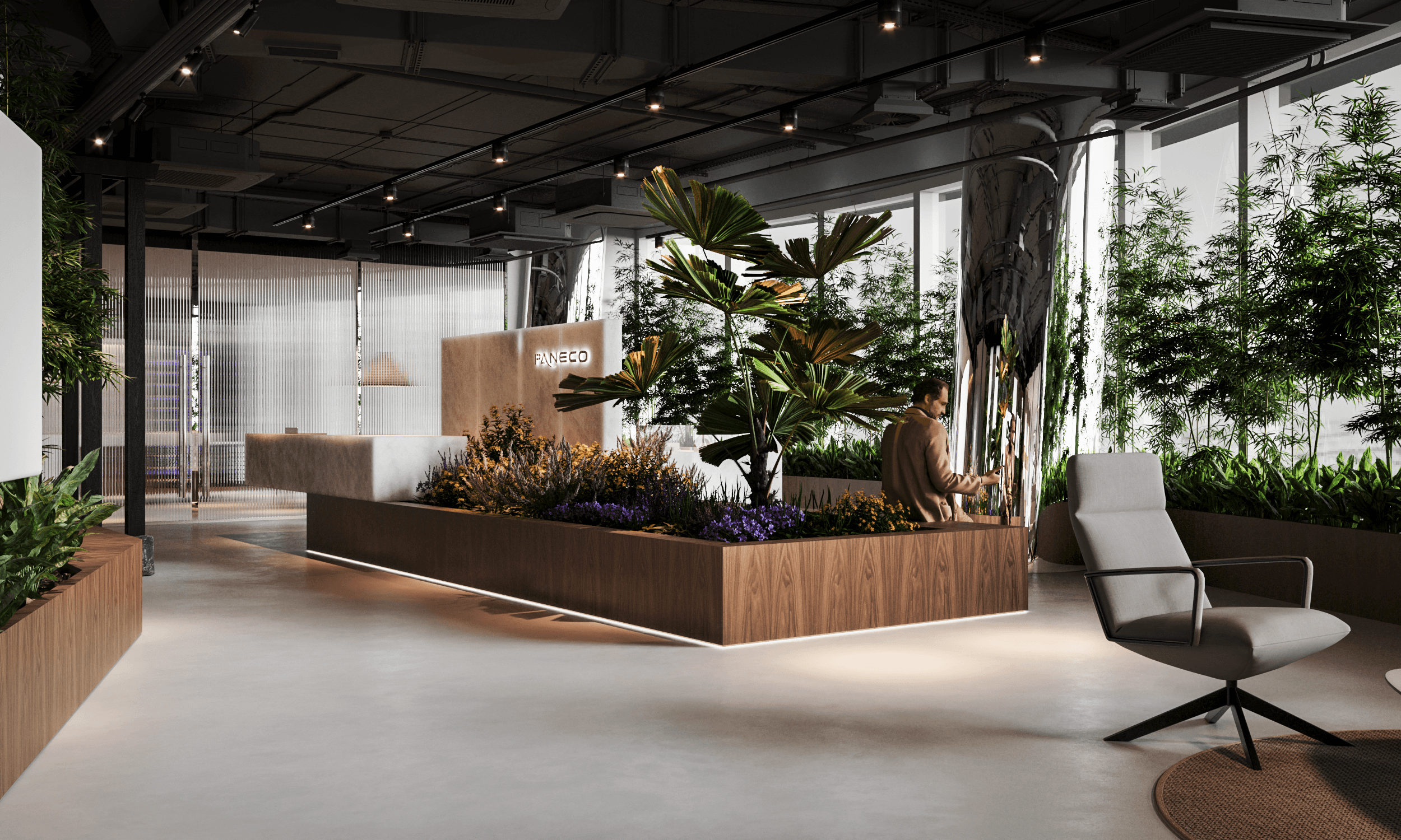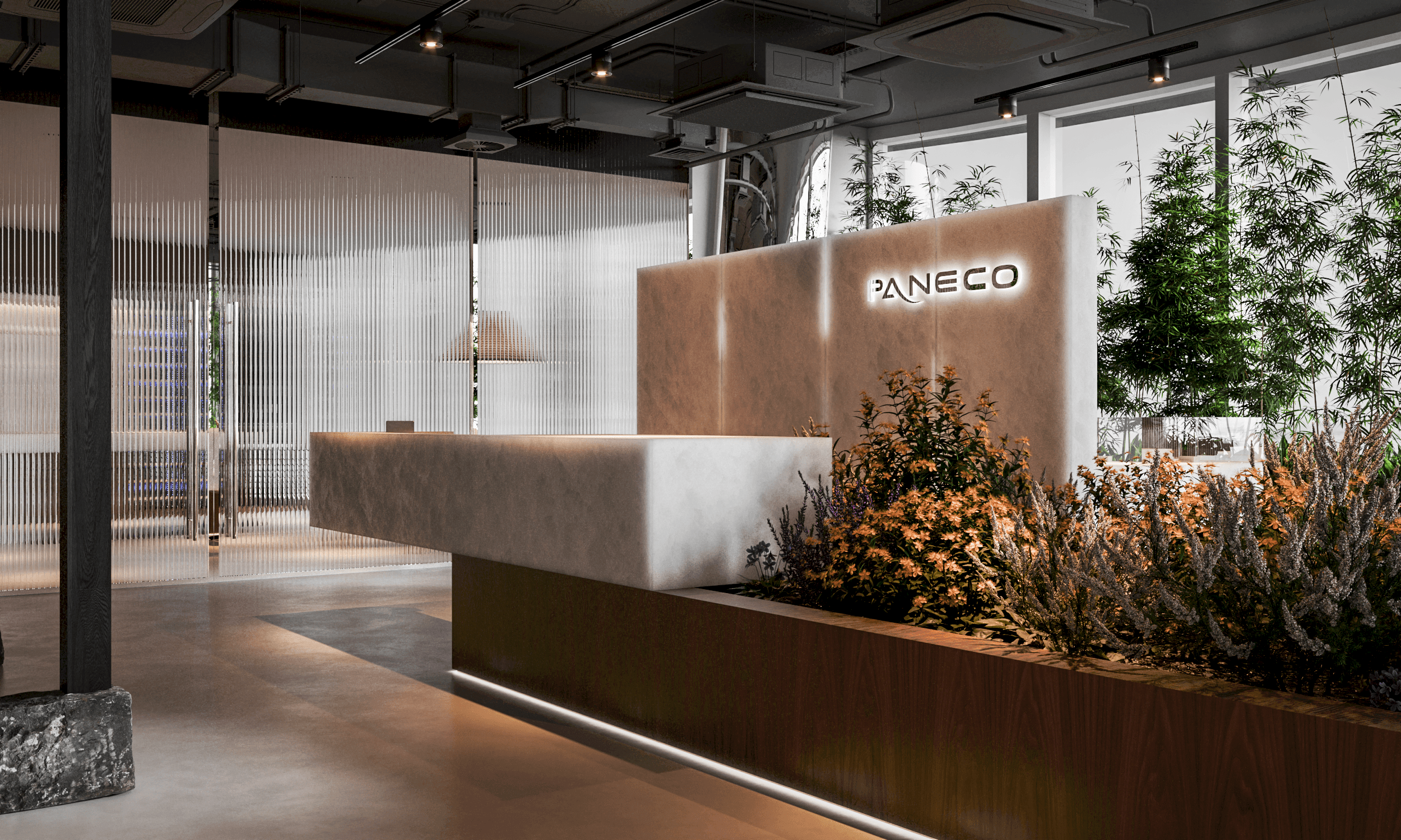 The office interior for PANECO, designed by our studio, is a prime example of a modern workspace that combines elegance, functionality, and natural aesthetics.
