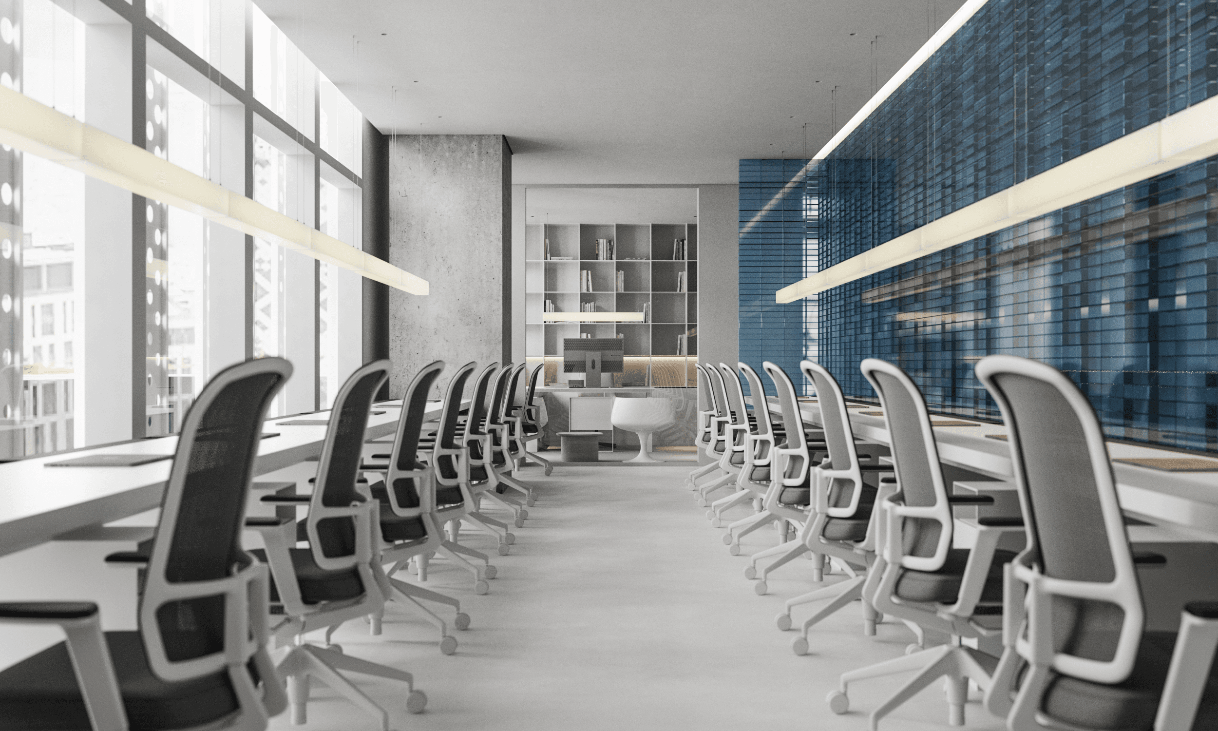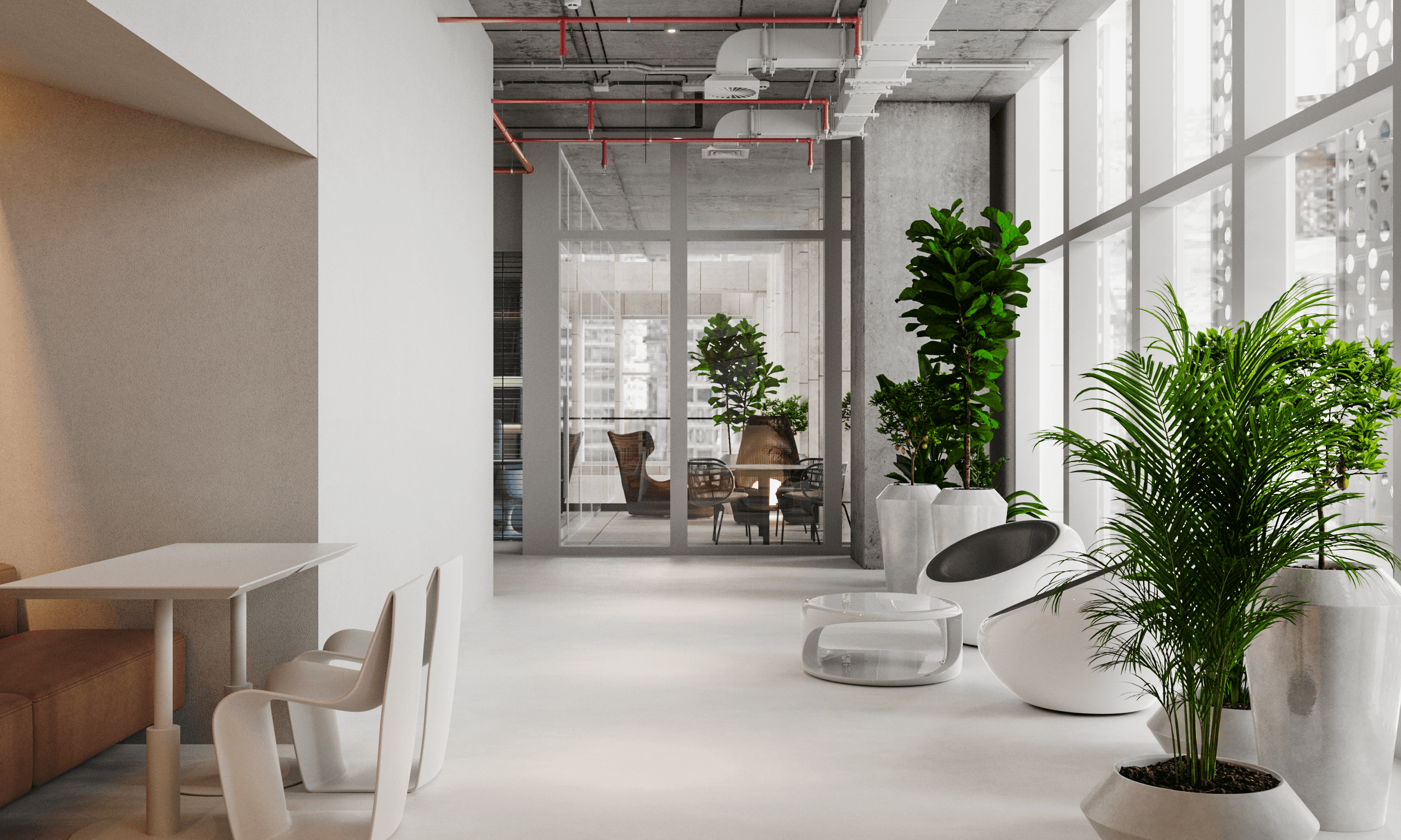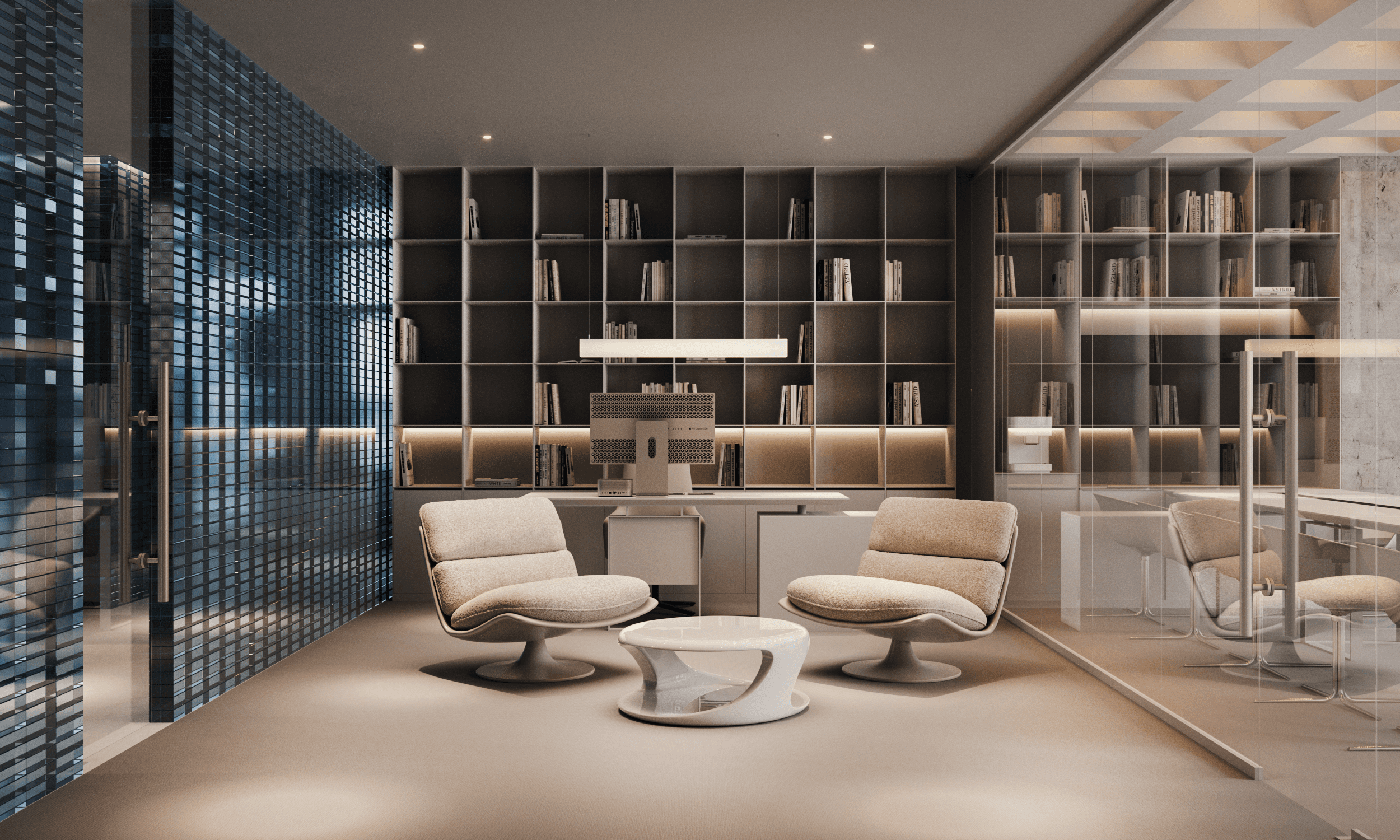 We create this interior redefines the concept of a modern office, focusing on a seamless blend of openness, functionality, and refined aesthetics. The space is characterized by its generous use of natural light, pouring in through expansive floor-to-ceiling windows. These windows not only illuminate the area but also create a dynamic connection between the interior and the urban landscape outside, enhancing the sense of scale and energy within. At the heart of the design lies a sophisticated zoning strategy.