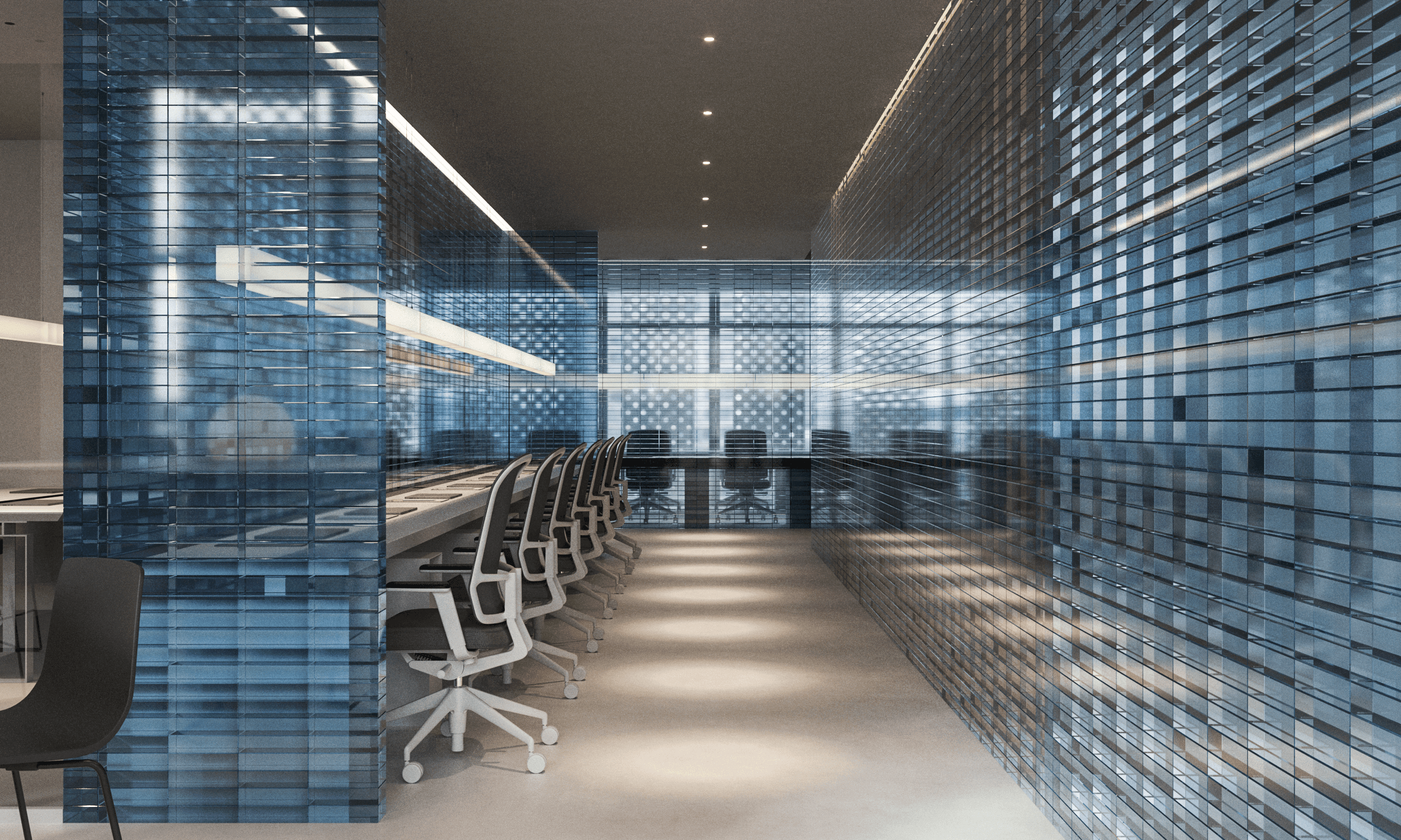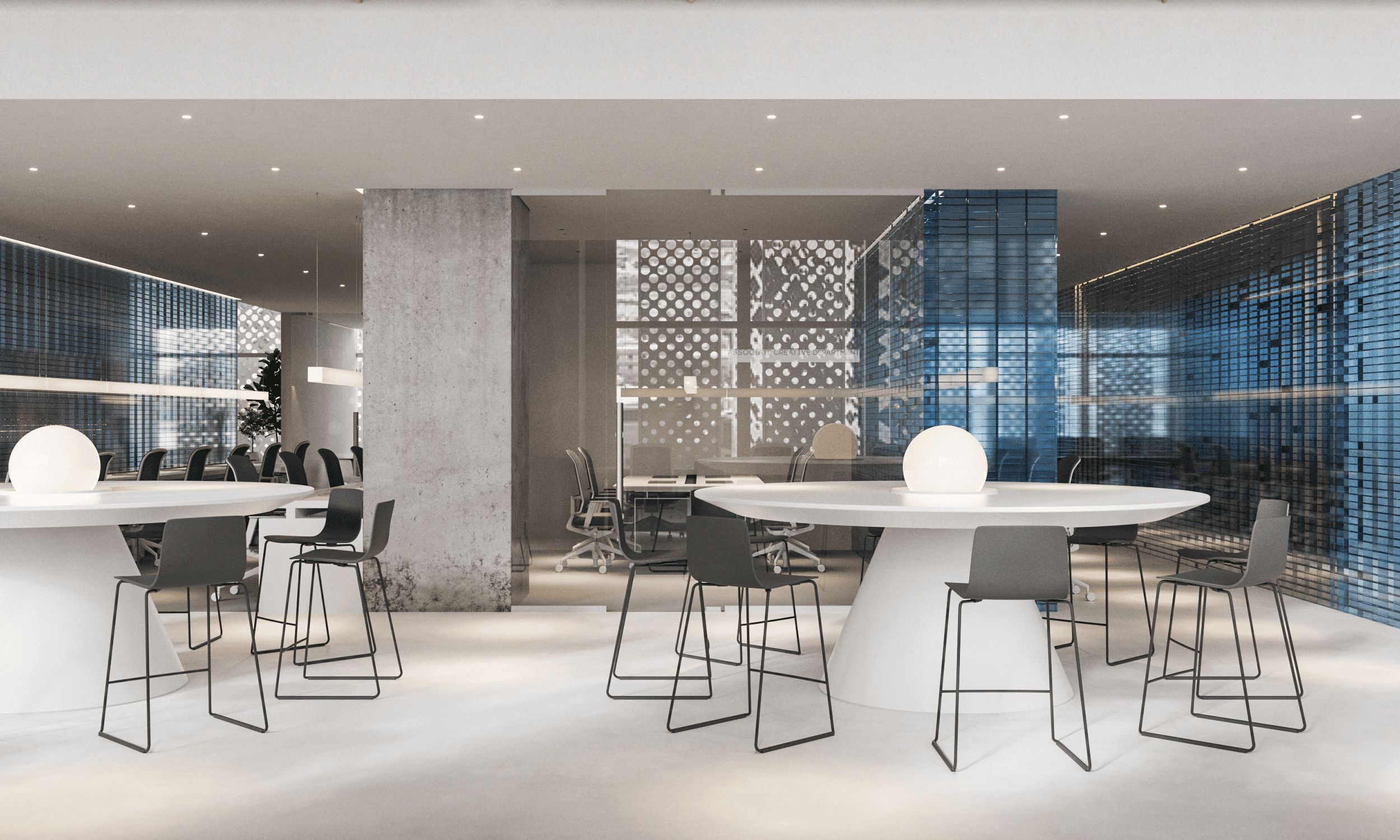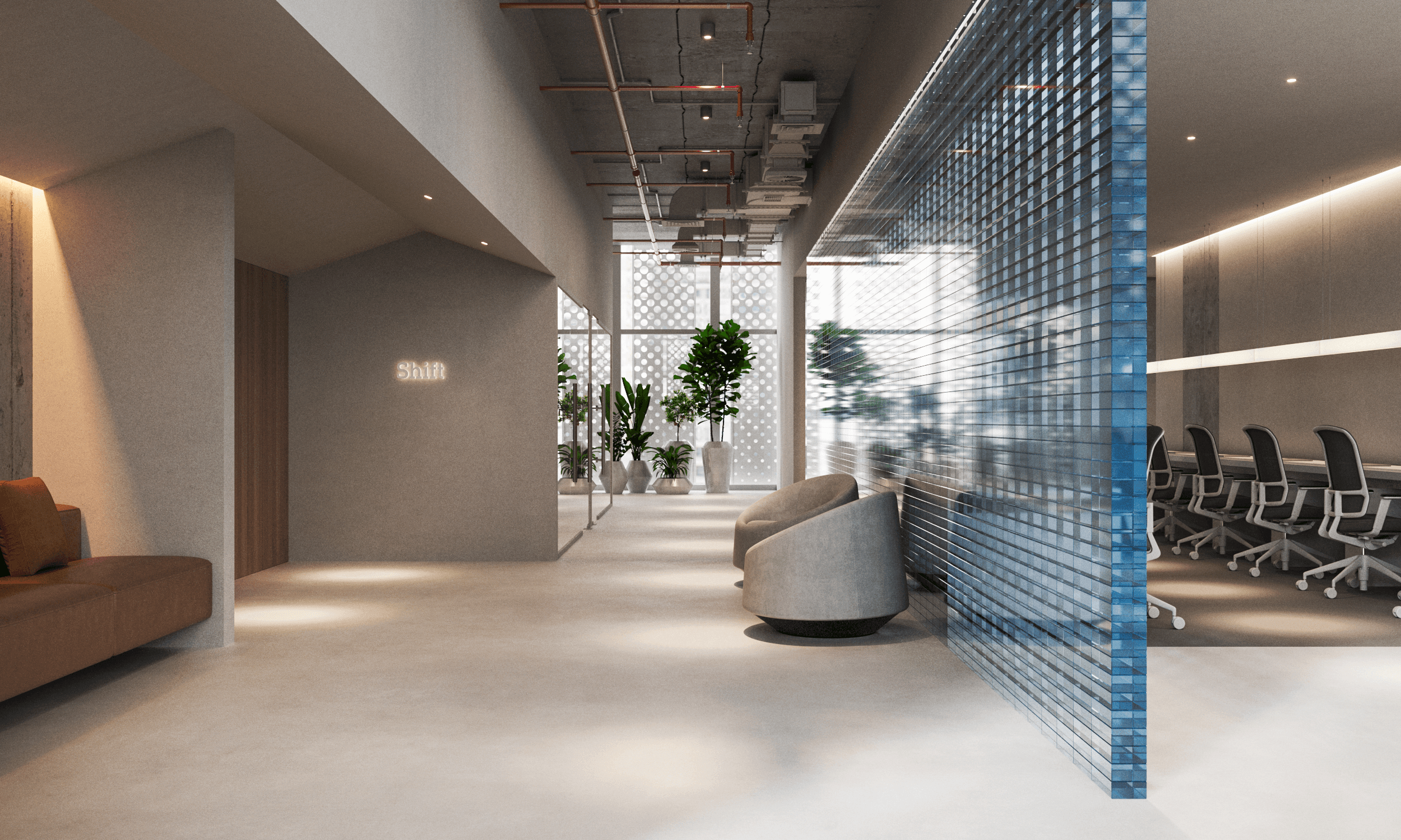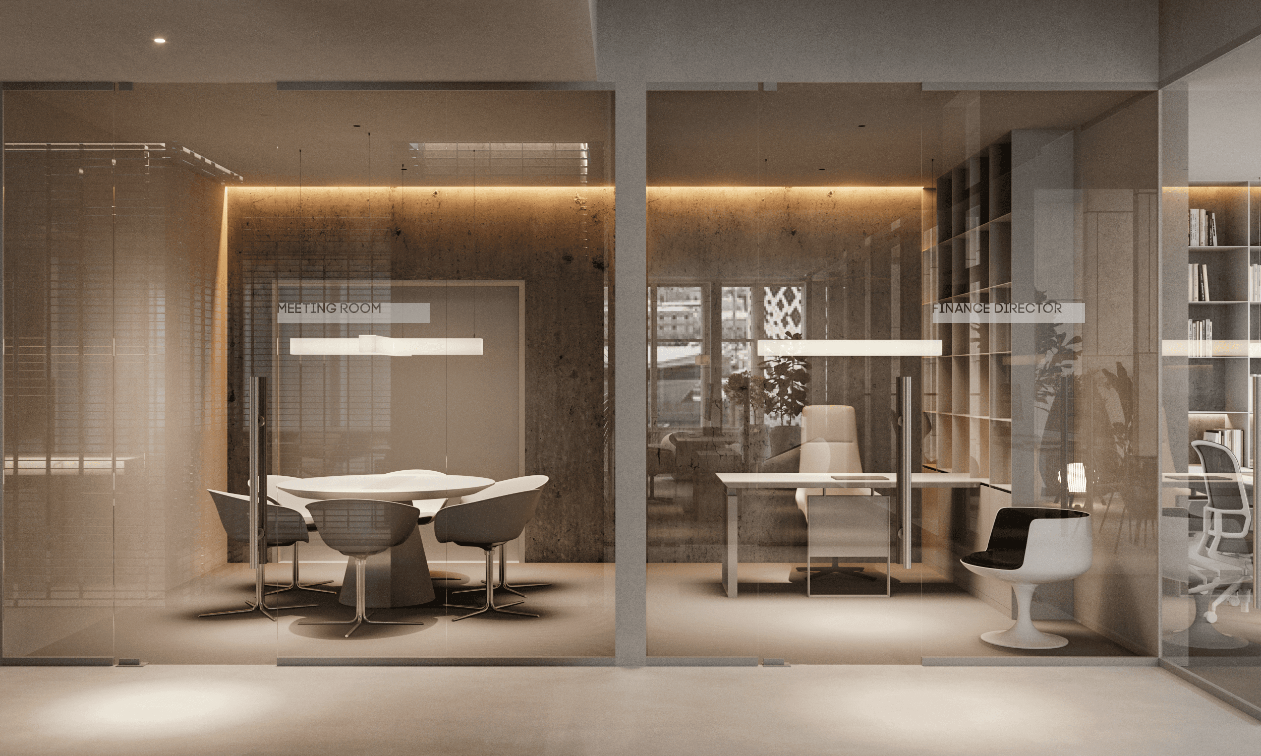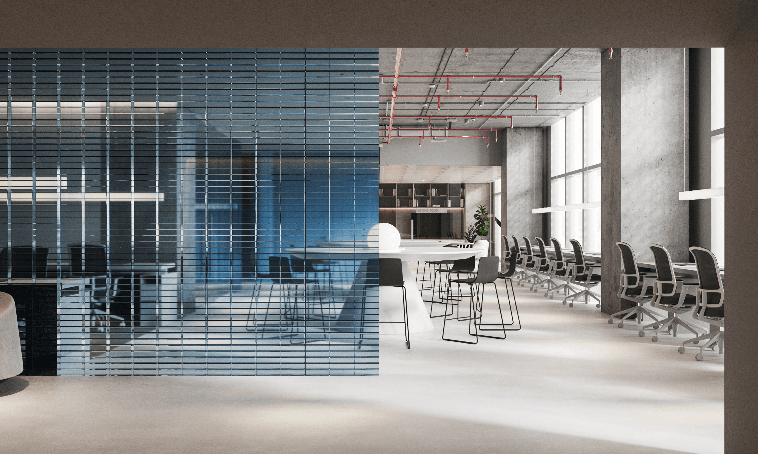 Transparent glass partitions with a unique textured finish delicately divide the space, offering subtle boundaries without sacrificing the flow of light or the visual continuity. This approach fosters a collaborative yet focused atmosphere, balancing the needs of teamwork with individual productivity.
